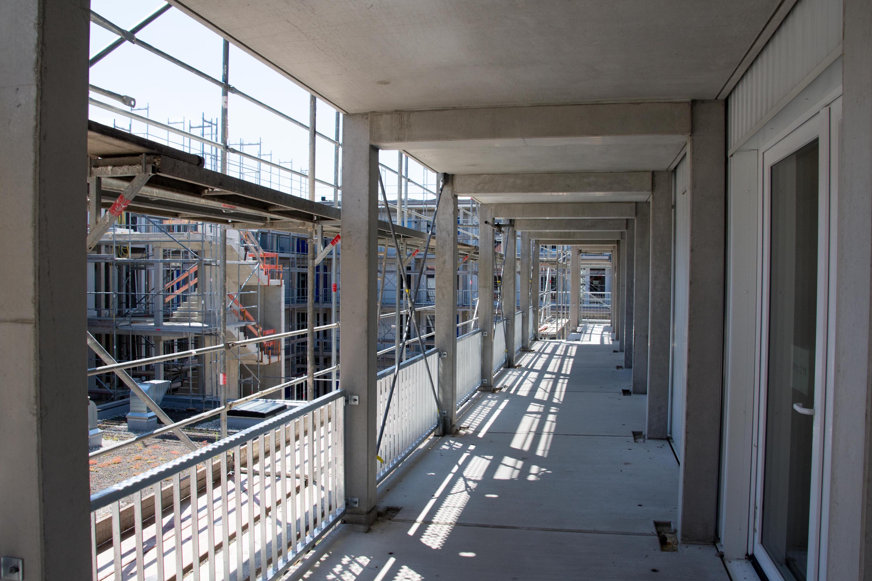 Durch die hohe statische Auslastung des Holzbaus musste der Laubengang als komplett freistehendes Einzelbauwerk ohne jegliche Anbindung ans Gebäude geplant werden. Er besteht aus Fertigteilen, im Hinblick auf die Schwingungsanfälligkeit wurde technisch an die Grenzen des Machbaren gegangen.