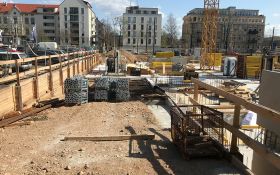Nach einer überraschenden Kältephase, welche zum zweiwöchigen Stopp auf der Baustelle führte, schreiten jetzt die Arbeiten im Untergeschoß zügig voran. Nach intensiver Planungsphase sind erste Ergebnisse vor Ort sichtbar. Der Teilbereich Untergeschoß 2 ist erstellt ebenso die Bodenplatten vom Bereich UG 1 bereits betoniert. Der Focus der Bauleute liegt nun auf den weiteren Arbeiten im Untergeschoß.