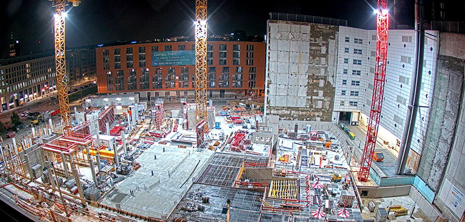 Baufortschritt des Vorhabens MaryAnn Apartments am Postplatz Dresden. Die Arbeiten schreiten voran, das Untergeschoss ist erstellt und das Erdgeschoss in der Ausführung.