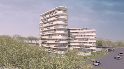 Beauftragung erfolgt – In exponierter Lage als westlichen Abschluss der Höhenpromenade des Neubaugebietes Dresden Gorbitz entsteht in signifikanter Form ein Baukörper, eingeteilt in zwei Gebäudeflügel, sechs- bzw. neungeschossig mit gemeinsamer Tiefgarage. Für die Architektur zeigen sich ZDR Architekten aus Dresden verantwortlich.