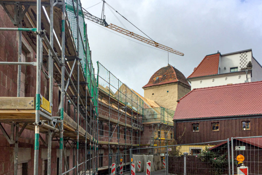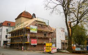 Bei diesem Bauvorhaben wird eines der ältesten Bauwerke der Stadt - ein Turm der mittelalterlichen Stadtbefestigung - restauriert und in den Hospizneubau integriert.