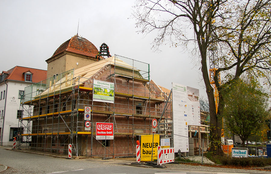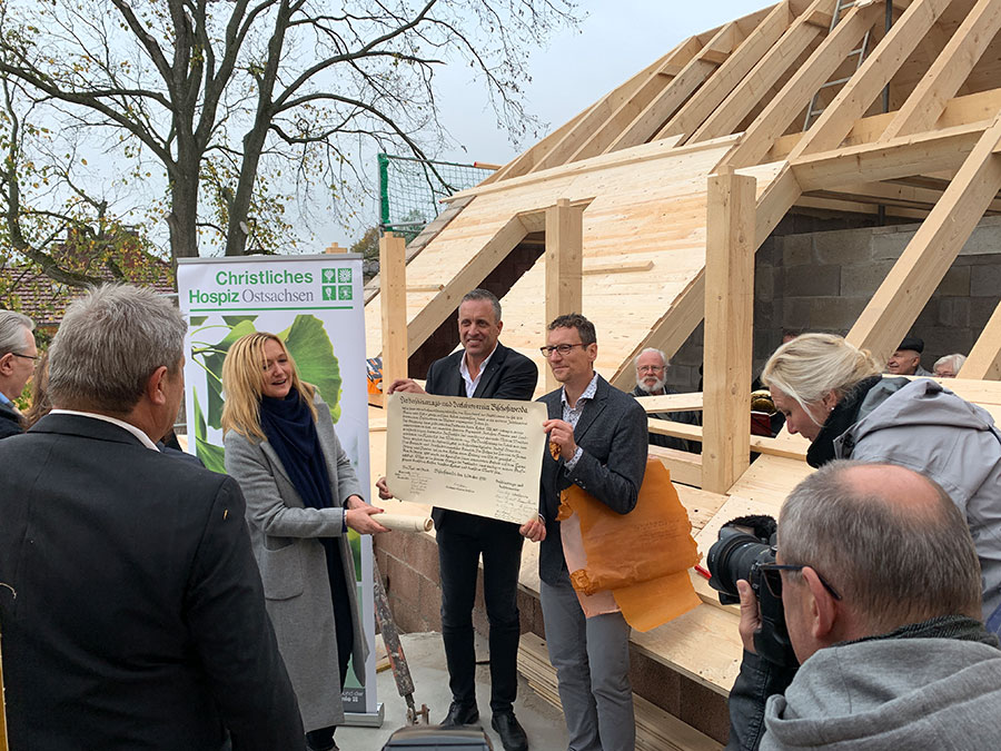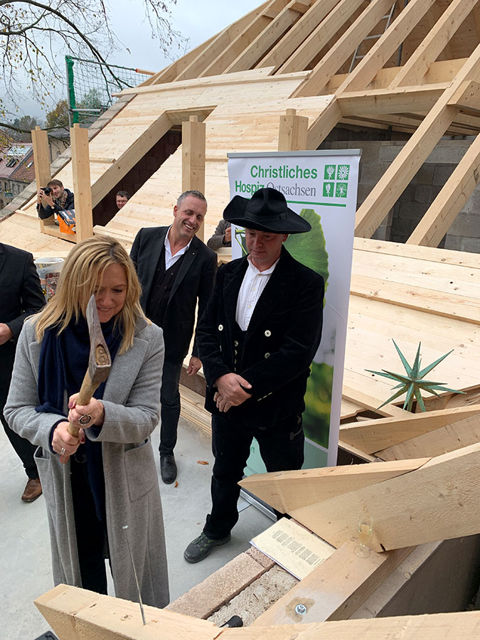 Dem Christlichen Hospiz in Bischofswerda wurde am 29. Oktober feierlich die Richtkrone aufgesetzt. Unter den Augen aller Anwesenden schlug die Schirmherrin Anja Koebel den letzten Nagel in den Dachstuhl. Der anschließende Richtspruch galt allen beteiligten Firmen und den Besten Wünschen für das Haus und seine Nutzer.