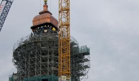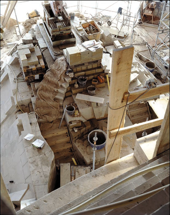 Der Dachstuhl der Laterne ist nach dem originalen Vorbild entworfen worden, jedoch waren ingenieurmäßige Holzverbindungen notwendig. Die vertikalen Stützen des Laternendaches bestehen aus Sandsteinmauerwerk und mussten vorgespannt werden, um die Standsicherheit zu gewährleisten.