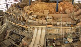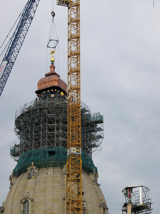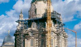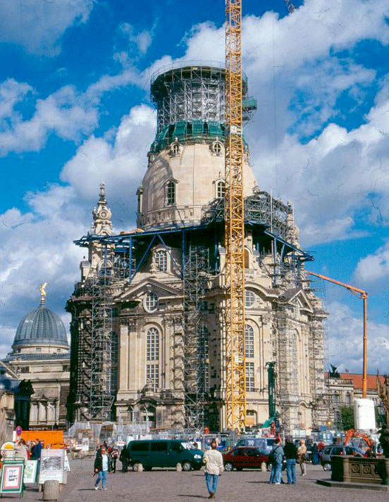 Der Wiederaufbau der Dresdner Frauenkirche begann 1994 und endete im Oktober 2005. Durch Installation eines das gesamte Bauwerk überspannenden Wetterschutzdaches konnte der Wiederaufbau ohne Pausen auch in den Wintermonaten erfolgen.