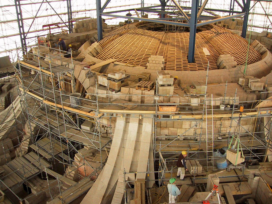 Die Kuppel der Frauenkirche zu Dresden wurde wieder in Stein als zweischalige Konstruktion mit einer Wetterschutz- und Tragschale außen und einer raumabschließenden dünnen Schale nach innen ausgebildet. Beide Schalen sind mit aussteifenden Querschotten verbunden. Die Kuppel enthält keine gesonderte Dichtung und musste deshalb von der Außenseite her risssicher sein.