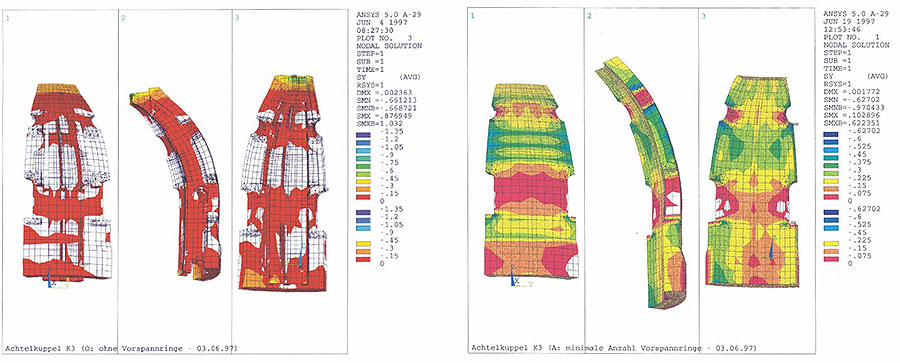 Die im originalen Bauwerk in der Kuppel vorhandenen Ringanker aus Vierkanteisen hatten sich als nicht ausreichend tragfähig erwiesen und zeigten bis zur Wirksamkeit zu große Dehnungen. Deshalb wurden beim Wiederaufbau die neuen Anker vorgespannt. Sie bestehen aus Feinkornbaustahl S690QL1. Zur Vorspannung wurde eine eigens dafür zusammen mit der Fa. Paul entwickelte Spanneinrichtung verwendet. Durch die Vorspannung wird eine ständige Überdrückung gewährleistet.