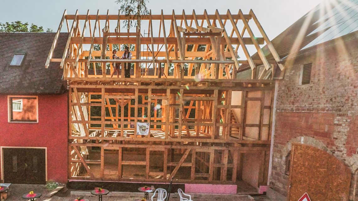 In einem bäuerlichen Dreiseitenhof im Dresdner Umland wurde ein traditionelles Fachwerkhaus aus geflöstem Fichtenholz gebaut. In der Detailplanung wurden neben historischen Zimmermannsverbindungen wie Zapfen und Holznägeln, Fersenversätzen, Schwalbenschwanzblättern oder schrägen Hakenblättern mit Eichenkeilen auch moderne Ingenieurverbindungen genutzt (Auflagerverstärkung mittels Vollgewindeschraube und Stahlplatte).